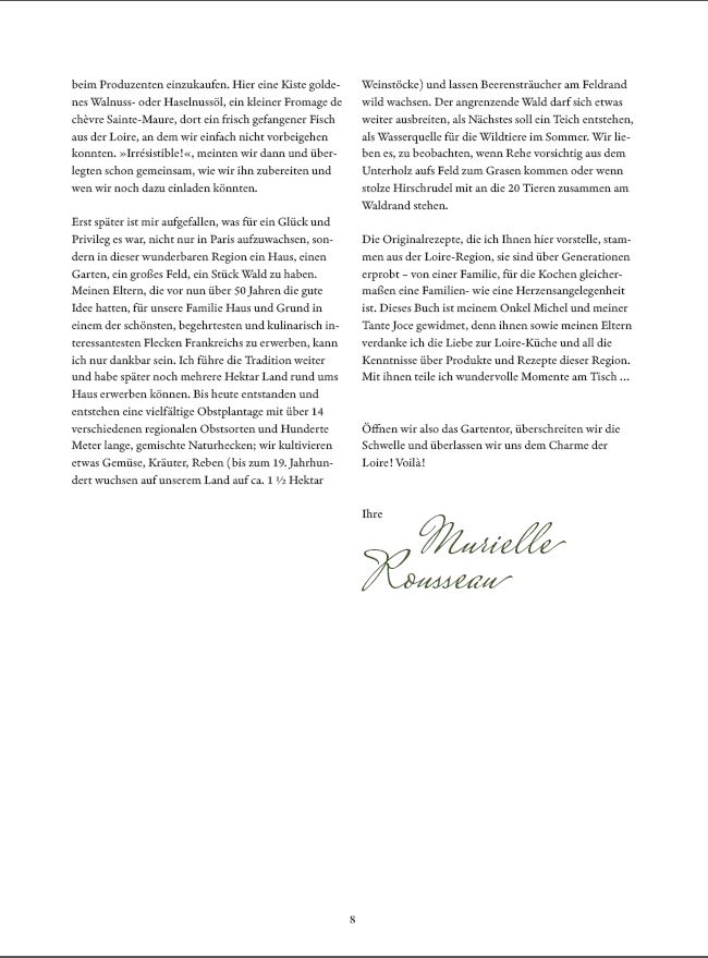 Das Piquet ist das Familienhaus an der Loire, das nach dem Tod meiner Eltern nun mir gehört und das ich in Teilen des Jahres bewohne. Hier hat jede Tischdecke, jedes Spitzendeckchen seinen Platz. Inmitten dieser Schätze aus Stoff entdeckte ich, fein eingerollt in Leinentischtücher, zwei sehr alte in feines Leder gebundene Bücher, die offensichtlich den Frauen meiner Familie gehörten und aus der Mitte des 19. Jahrhunderts stammen. Ein ouvrage über Gartenpflege, Haushalt, Wäsche- und Weinhaltung und ein anderes über Gemüse- und Obstlagerung und die französische Küche. Das alte manuel de cuisine sah aus, als wenn es oft und rege benutzt wurde. Es lagen in der Mitte handgeschriebene Blätter mit Rezepten für lapin sauté, gibier à plumes oder les quatre grandes soupes de France, die offensichtlich eine meiner Ahnen – ich schätze meine Ur-Ur-Urgroßmutter Rousseau – fein säuberlich aufgeschrieben hatte. Welch ein Schatz war mir hier in die Hände gefallen! Aus diesem manuel de cuisine habe ich für Sie die Rezepte ausgesucht, die mein Vater und meine Großmutter gerne und oft kochten. Ich habe sie viele Male selbst gekocht und leicht modernisiert.